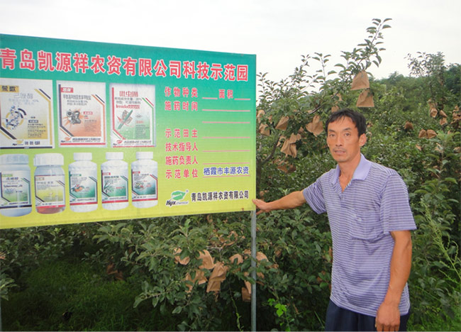 棲霞果樹(shù)區為膠東重點(diǎn)市場(chǎng),各公司同時(shí)也將棲霞定位為核心區域,為能更直觀(guān)的給零售店和農戶(hù)展示公司的產(chǎn)品效果和形象,5月5日與客戶(hù)一起到棲霞市道村鎮的零售店孫錫濤處,道村零售店為棲霞重點(diǎn)零售店,每年銷(xiāo)售公司產(chǎn)品在3-5萬(wàn)。與零售店溝通在附近建立凱源祥公司示范園,免費提供實(shí)驗樣品,并插上公司的產(chǎn)品宣傳牌,幫助零售店加大基層的宣傳力度,零售店孫錫濤更是積極配合,馬上電話(huà)聯(lián)系當地的一個(gè)果樹(shù)種植大戶(hù),挑選出在公路邊的幾畝果園用于公司的產(chǎn)品示范園,并且將馬上要用的藥拿出樣品贈與農戶(hù)。