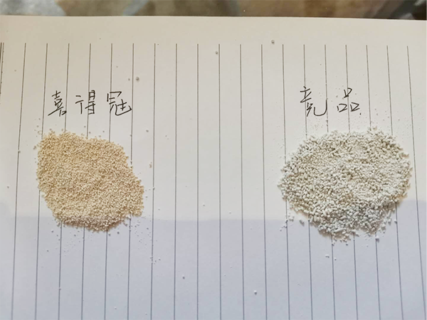 喜得冠顆粒大小更小、更均勻。競品為擠壓造粒,大小不一且有碎粒